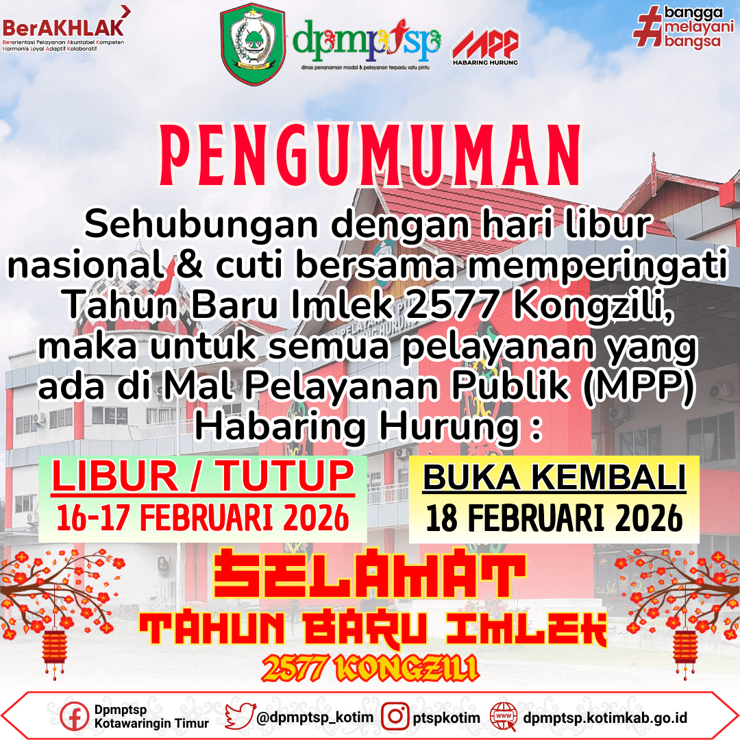 INFO LIBUR OPERASIONAL MPP HABARING HURUNG📢📢📢 Sehubungan dengan Hari Libur Nasional dan Cuti Bersama memperingati Tahun Baru Imlek 2577 Kongzili, maka seluruh pelayanan yang ada di MPP Habaring Hurung pada tanggal berikut : LIBUR/TUTUP🗓...