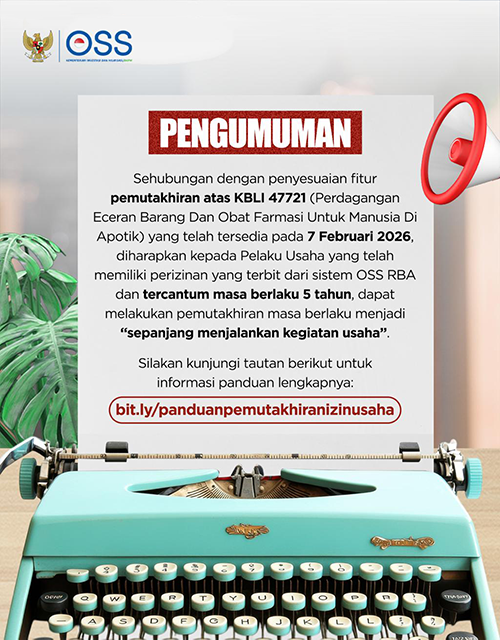 Fitur pemutakhiran atas KBLI 47721 (Perdagangan Eceran Barang Dan Obat Farmasi Untuk Manusia Di Apotik) telah tersedia di sistem OSS.