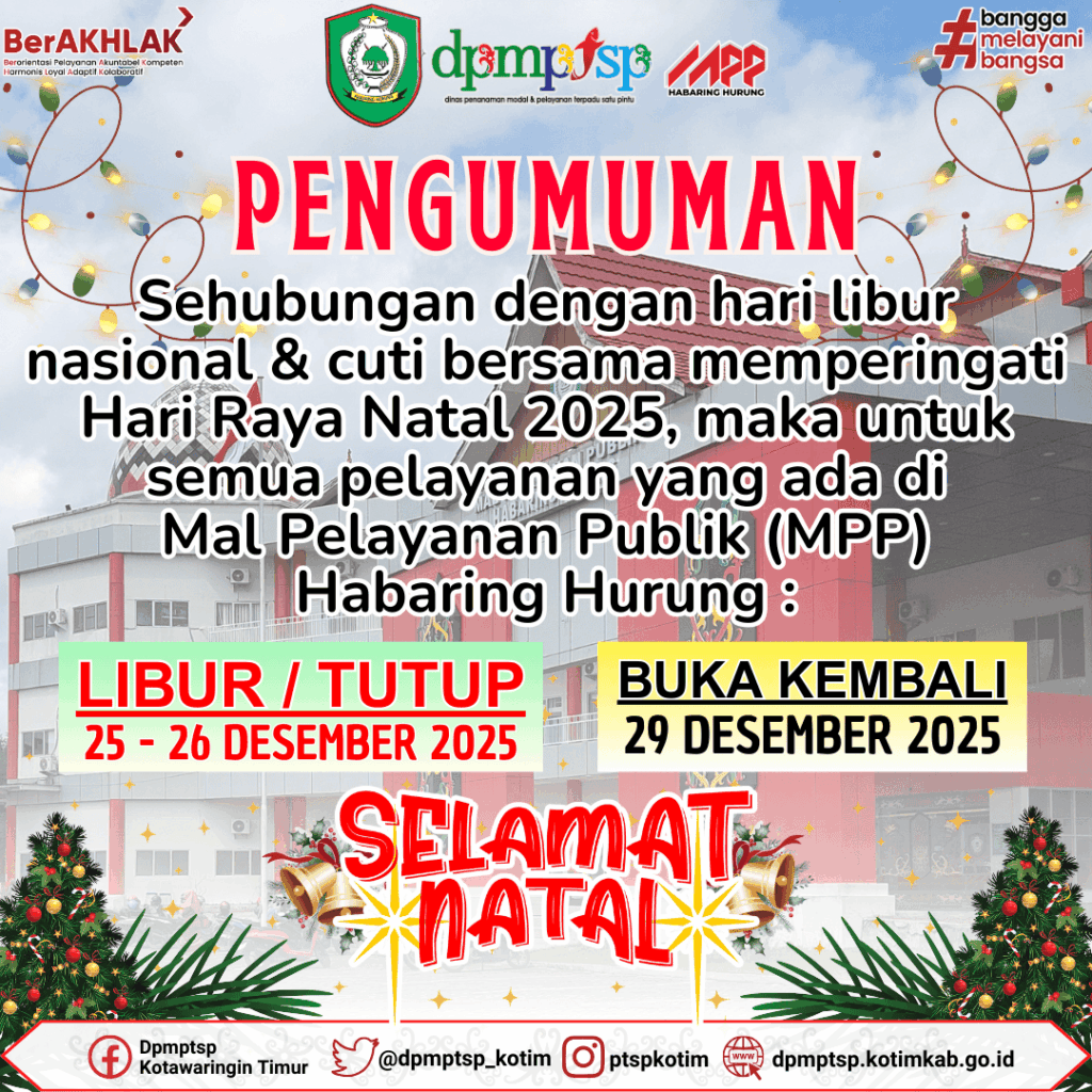 Sehubungan dengan Hari Libur Nasional & Cuti Bersama memperingati Hari Raya Natal 2025, maka seluruh pelayanan yang ada di MPP Habaring Hurung pada tanggal berikut :