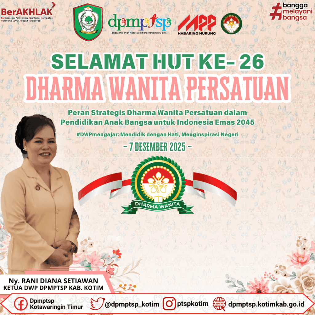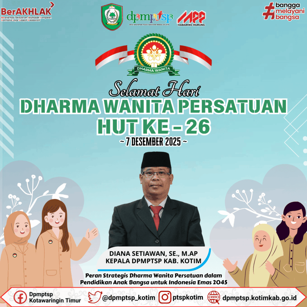 Kepala DPMPTSP Kab. Kotim, Bapak Diana Setiawan, SE., M.AP bersama Ketua Dharma Wanita persatuan DPMPTSP Kab. Kotim, Ny. Rani Diana Setiawan beserta seluruh Pegawai DPMPTSP Kab. Kotim dan seluruh anggota DWP DPMPTSP Kab. Kotim mengucapkan ✨️✨️