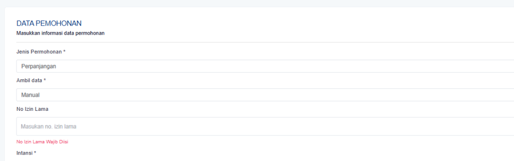 Pada saat mengajukan perpanjangan permohonan izin silahkan masukkan no permohonan lama secara manual agar pada saat proses simpan tidak ada kendala.