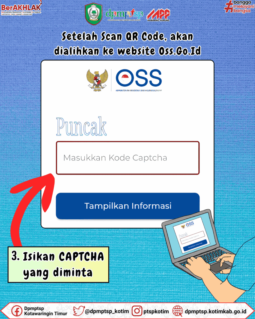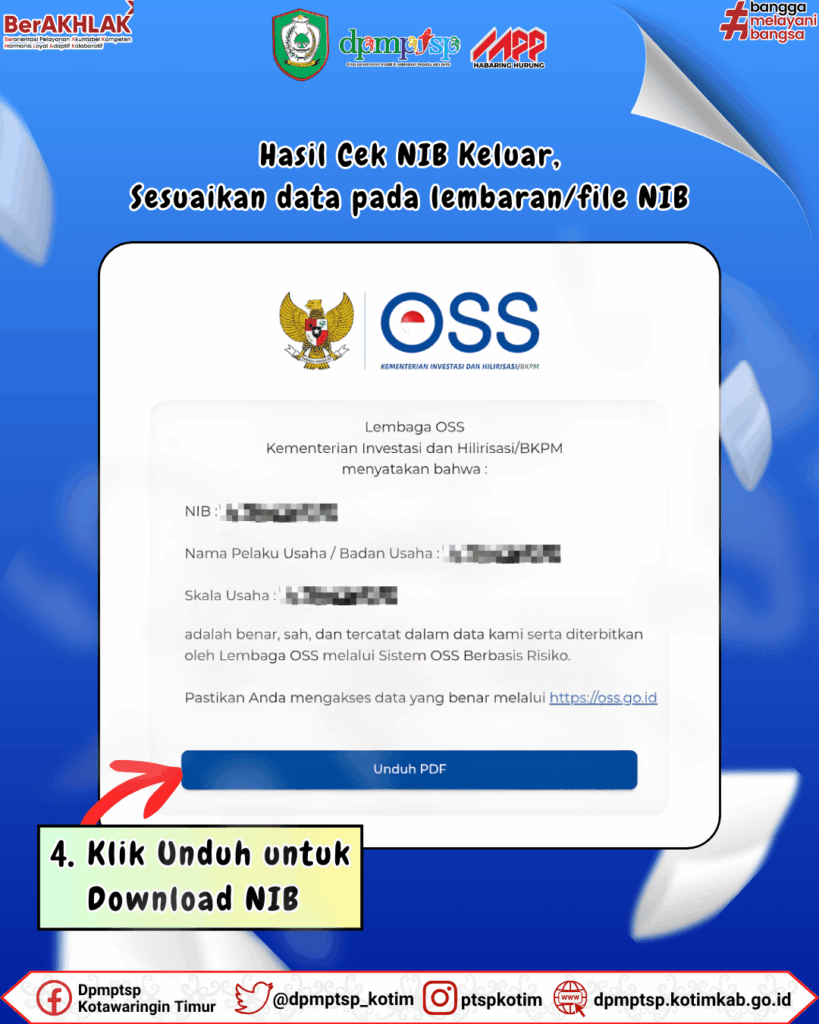 Urus langsung pembuatan NIB melalui website resmi OSS.GO.ID atau datang langsung ke Loket Layanan OSS DPMPTSP Kab. Kotim di MPP Habaring Hurung.